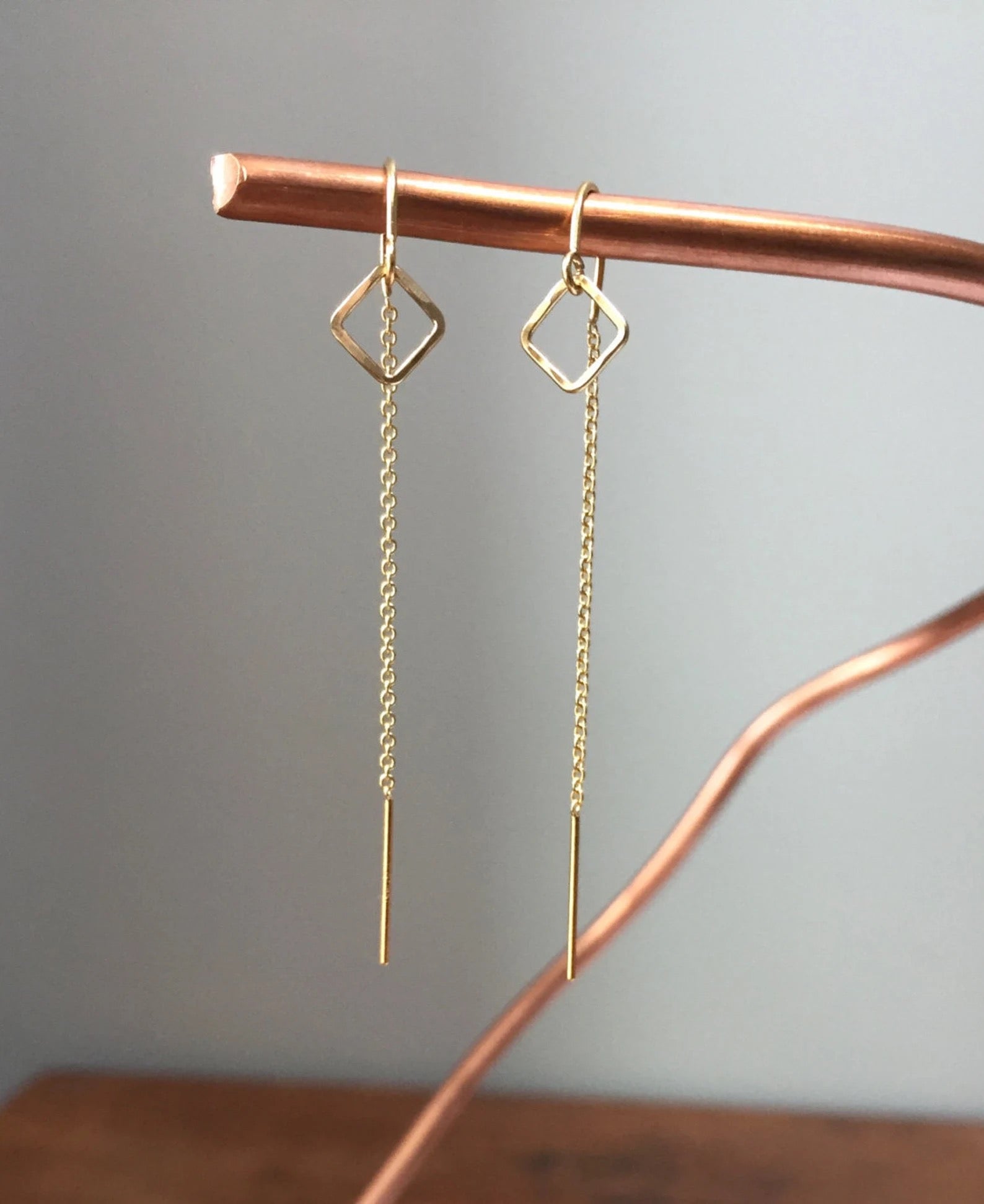 Handmade 14K gold-filled threader earrings with hammered square dangle.
