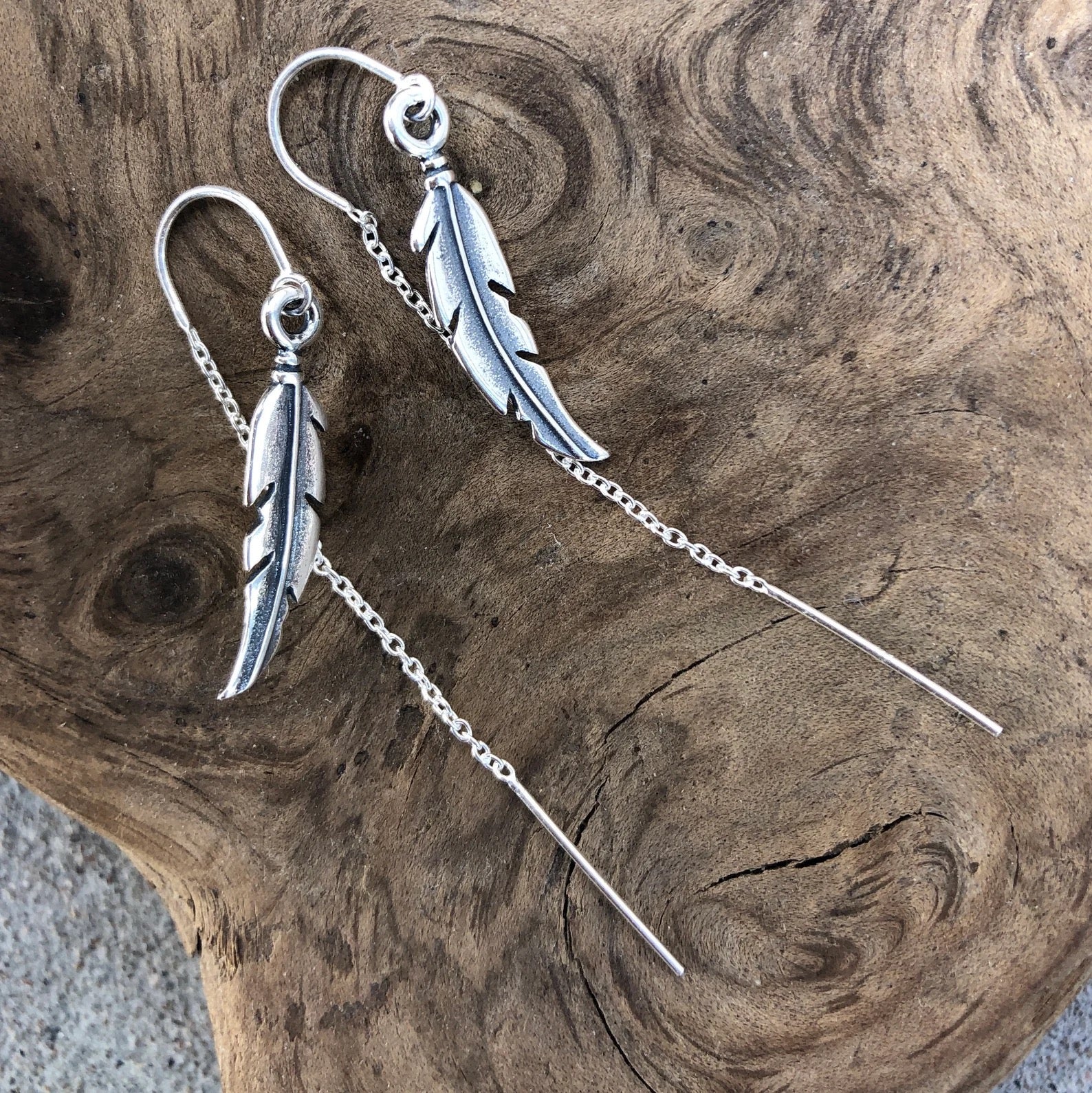 Boho Stelring Silver Threader Earrings with Feather Dangle.