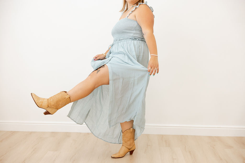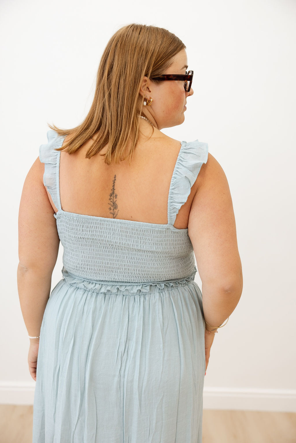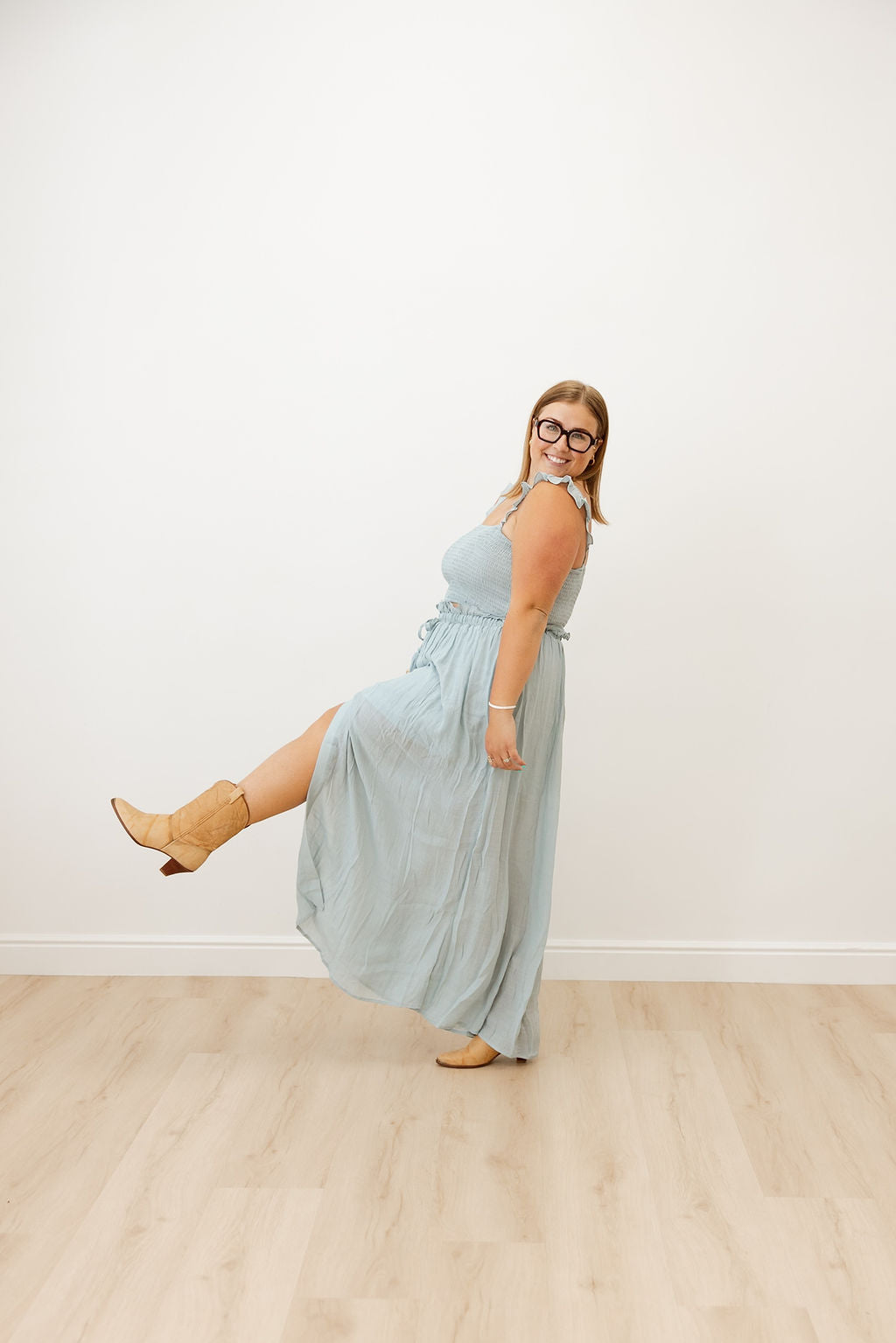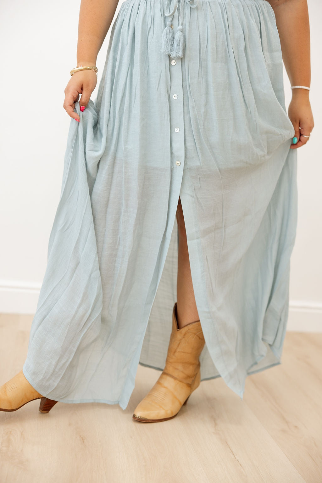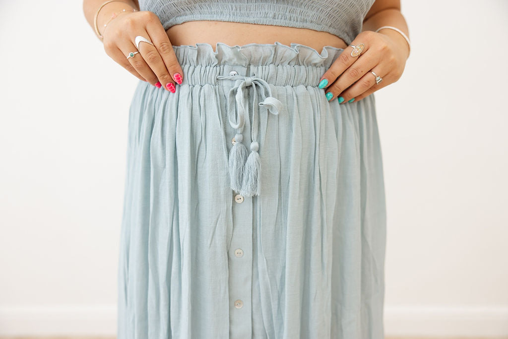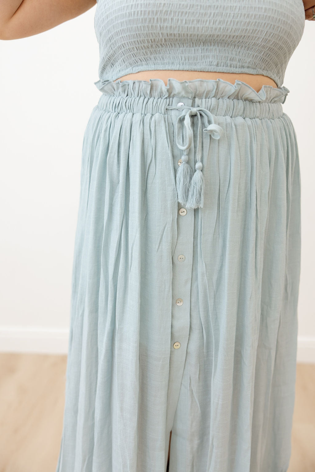 Light as a breeze and soft as salt air, The Seafoam Set is your ticket to instant coastal goddess energy. Featuring a smocked crop top with ruffled straps and a flowy button-front maxi skirt with tassel ties, this two-piece brings effortless romance to beach walks, brunch dates, and barefoot dances under the stars.