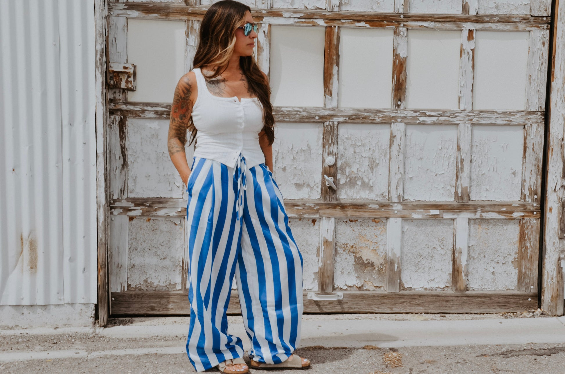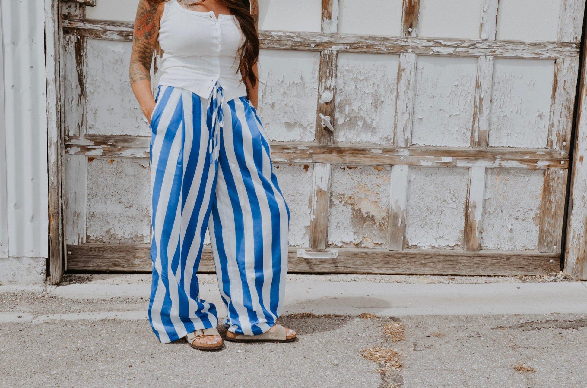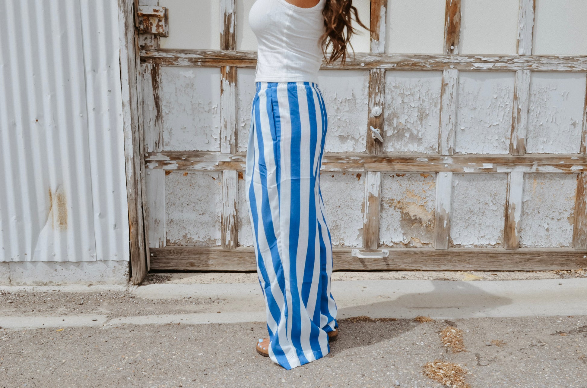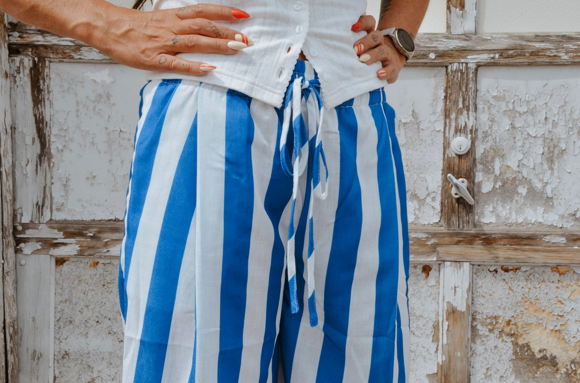 Sail into style with the Capri Striped Trousers — wide-leg, high-waist, and made for catching sea breezes or compliments (or both). Featuring bold cobalt and ivory vertical stripes, these lightweight trousers bring a playful pop to your wardrobe with just the right amount of drama. Pair them with a breezy tee or a fitted tank for the ultimate sun-chasing look.
