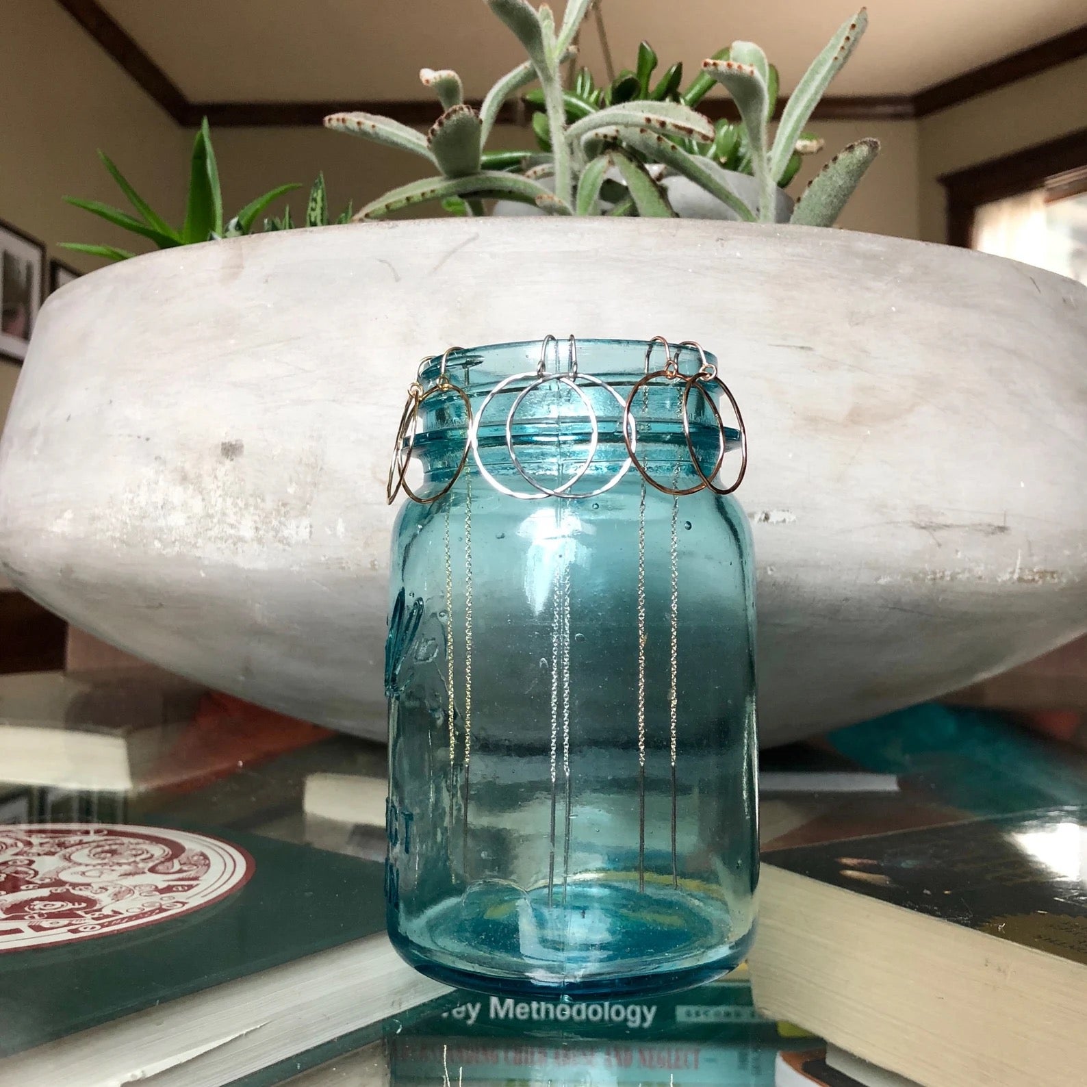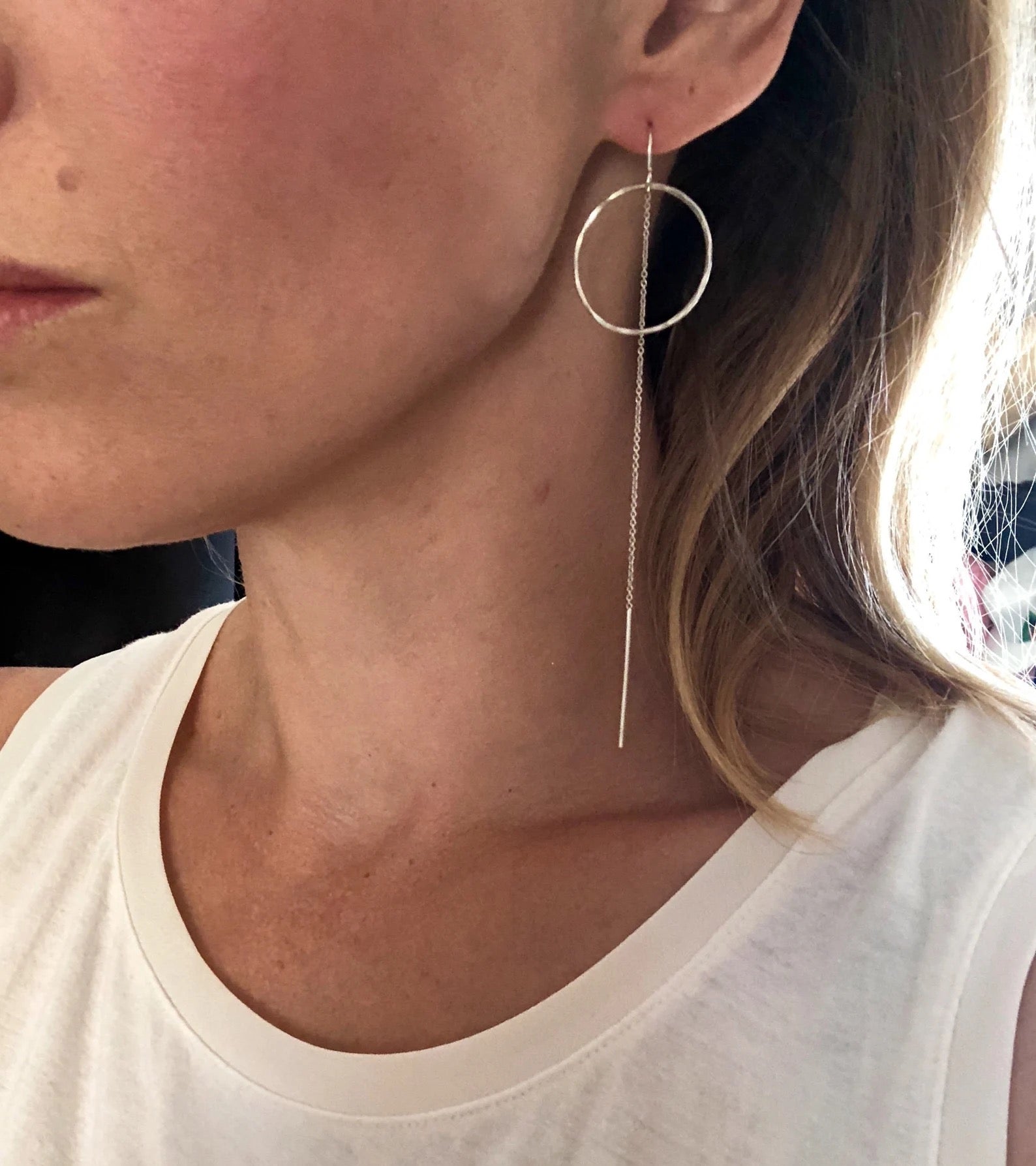 14K yellow gold hammered circle Threaders. Long back hangs about 4.5" down in the back. Nickel free, safe for sensitive ears. So comfortable and light!