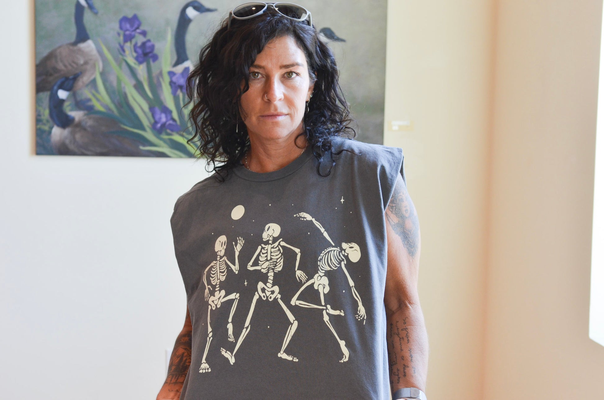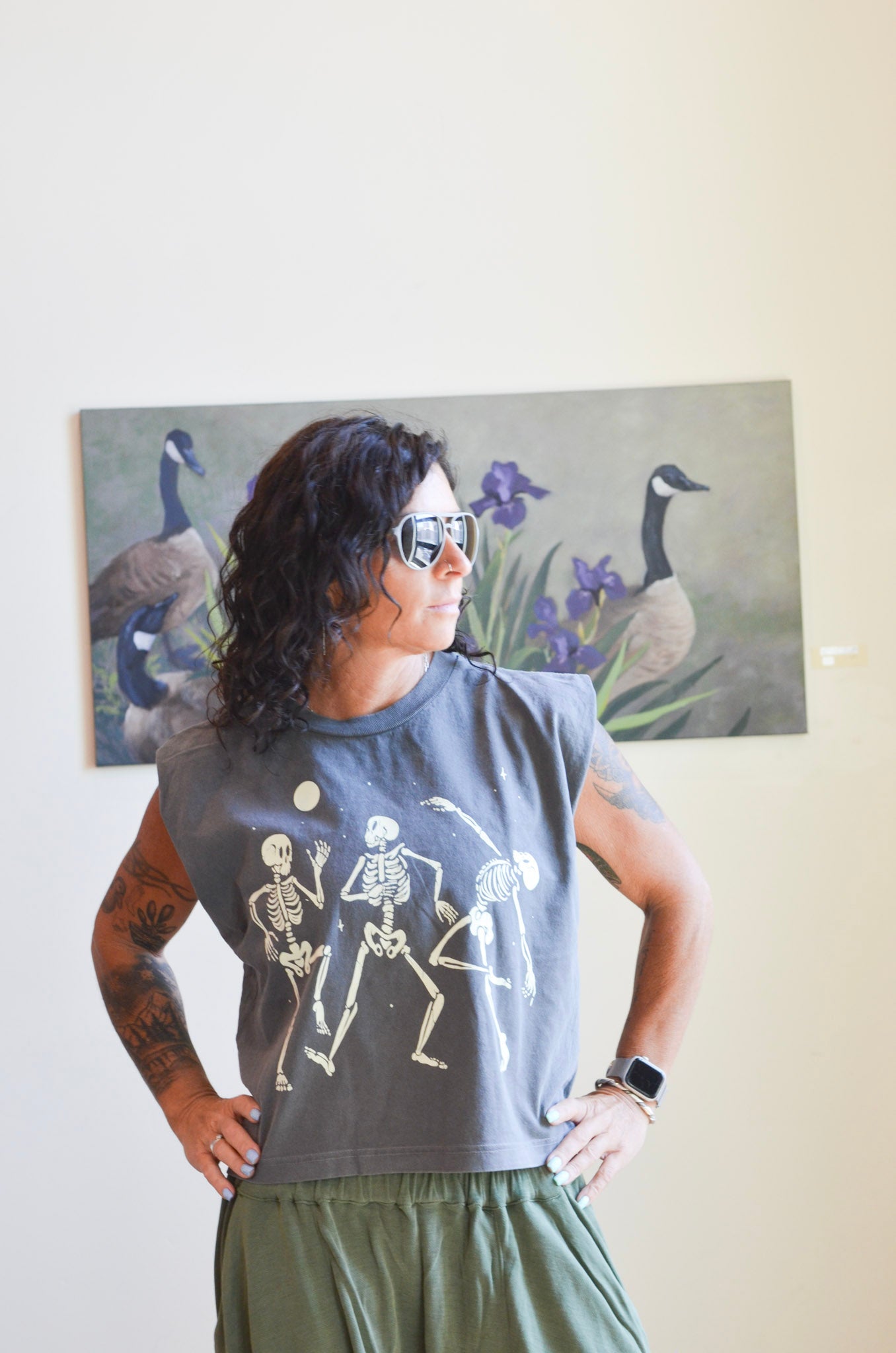 The afterlife called—they want their groove back. The Boogie Bones Muscle Tank is made for moonlit mischief, spontaneous dance parties, and anyone who doesn’t take life (or death) too seriously. With a vintage wash, raw edges, and a trio of skeletons gettin’ down under the stars, this tee brings spooky season vibes year-round. Pair with high-rise jeans or cutoffs and let your inner ghoul shine.