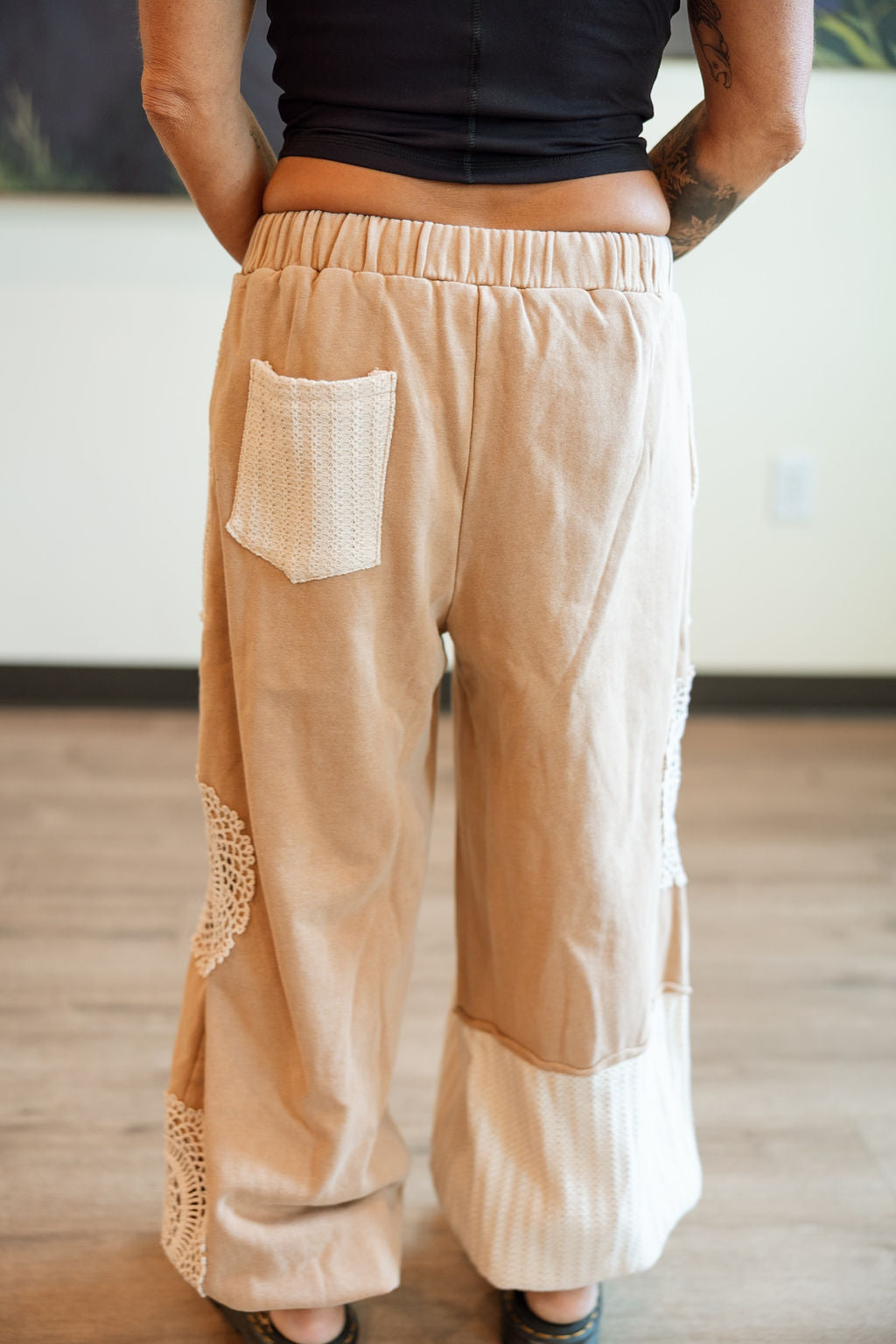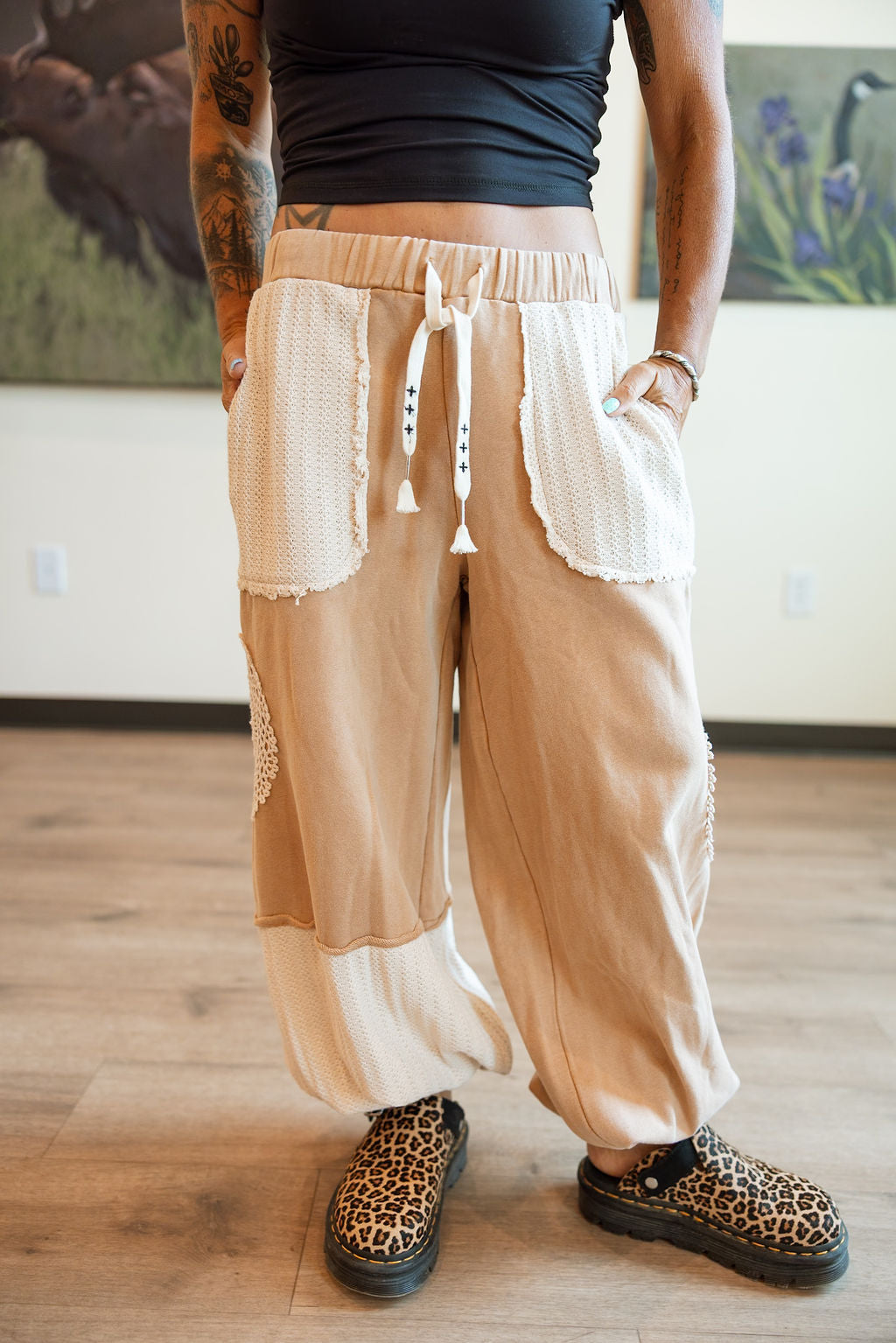 Made for daydreamers, market wanderers, and barefoot-in-the-living-room types. The Patchwork Poet Pants blend comfy, oversized vibes with vintage soul—featuring knit textures, crochet details, and raw-edge patchwork that feels one-of-a-kind. The drop-crotch silhouette and wide leg give them that slouchy, artsy flow, while the soft drawstring waist keeps it all easy-breezy. Pair with a tank and sandals or layer up with a chunky cardigan for peak cozy.