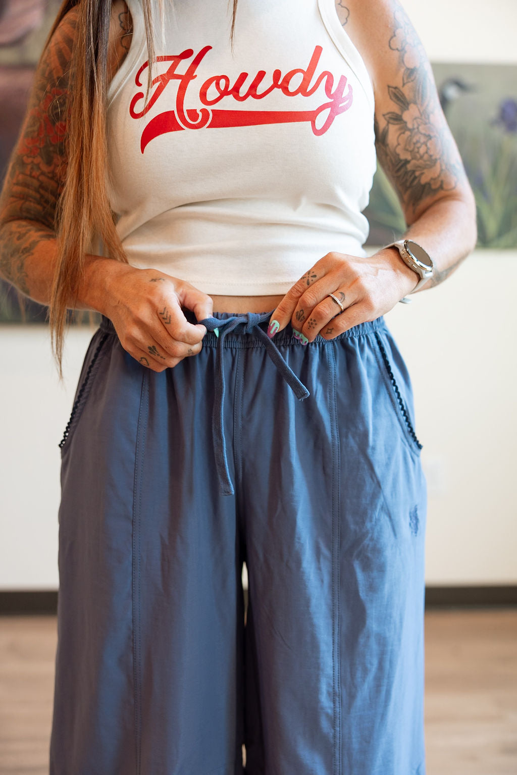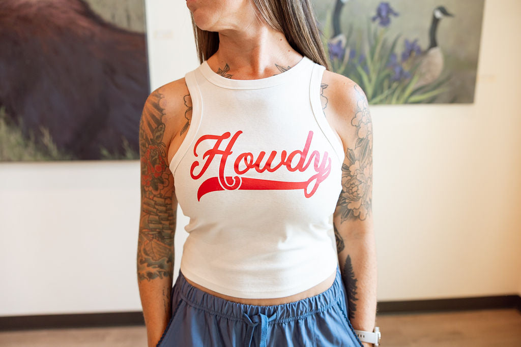 Say it loud, say it proud—Howdy. This bold and playful tank is your new summer go-to, featuring a bright cherry red western script on soft, off-white cotton. With a high neckline and flattering cropped fit, it’s made for pairing with cutoffs, denim skirts, or your favorite rodeo boots. Whether you’re headed to a concert, market, or just living your best cowgirl life, this tank’s got the sass to match your vibe.