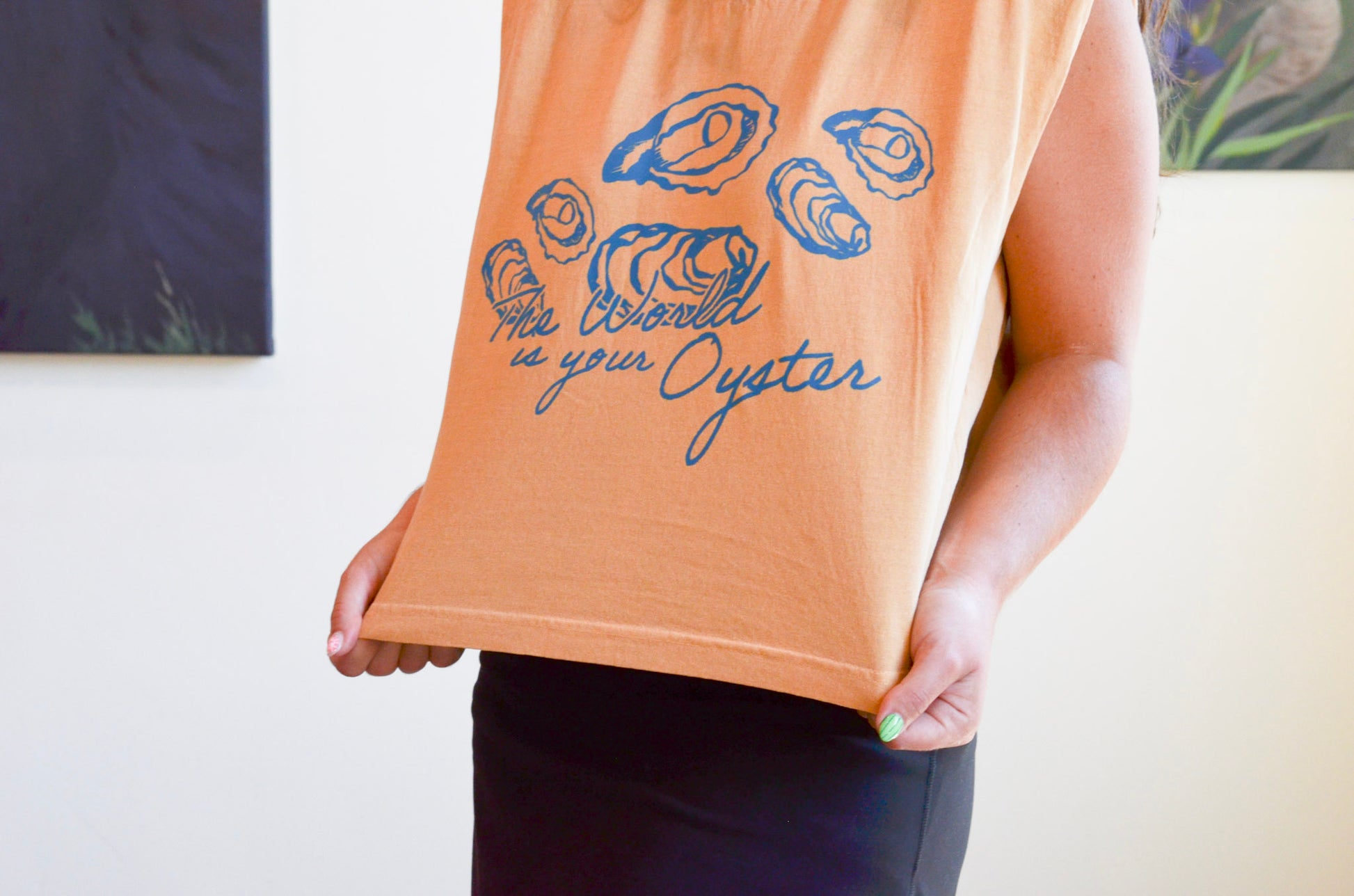 Because life’s better when you believe the pearls are out there. The Oyster Optimist Muscle Tank serves up major good vibes with a retro oyster graphic and the cheeky reminder that “The World is Your Oyster.” With a relaxed fit and raw-edge sleeves, it’s perfect for beach days, road trips, or manifesting your next big thing. Wear it with denim cutoffs or toss it over your swimsuit and go find your pearls.