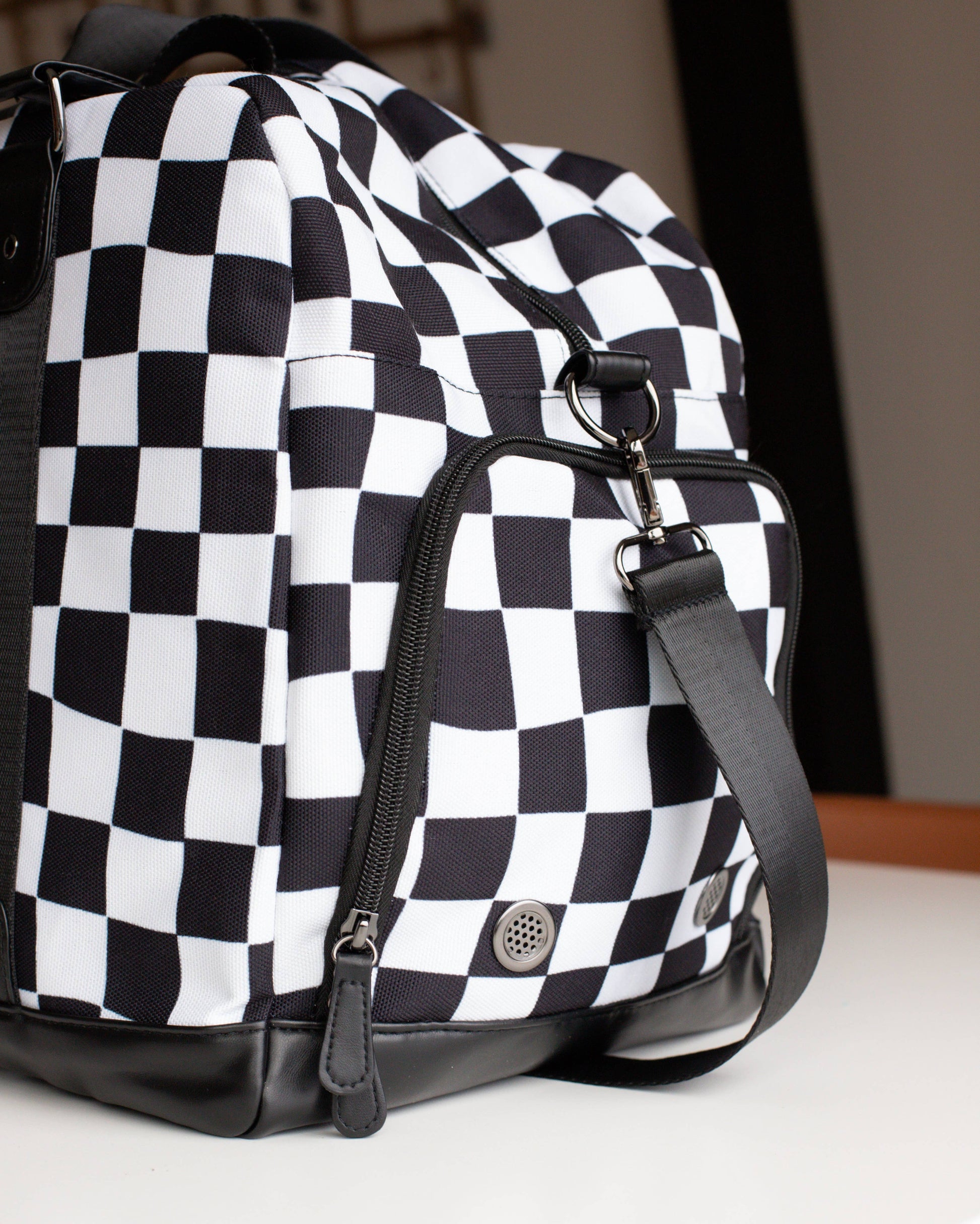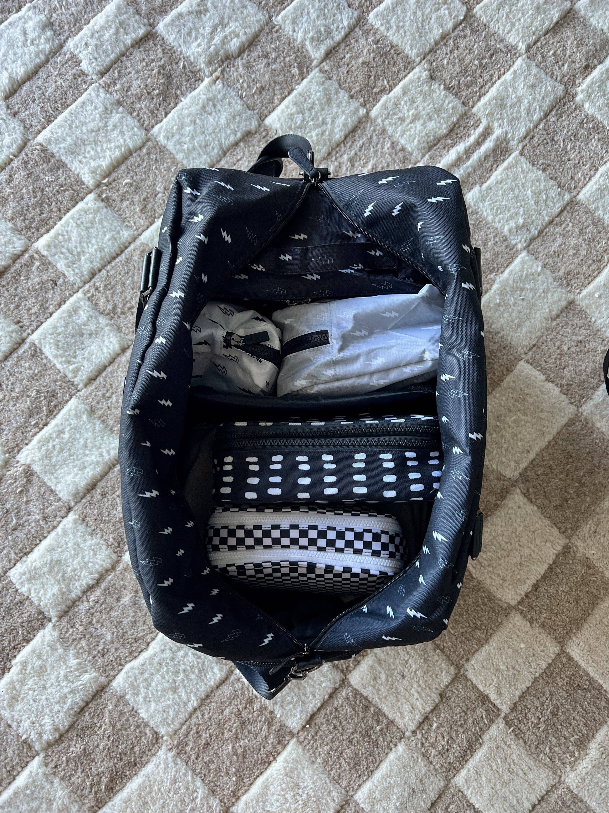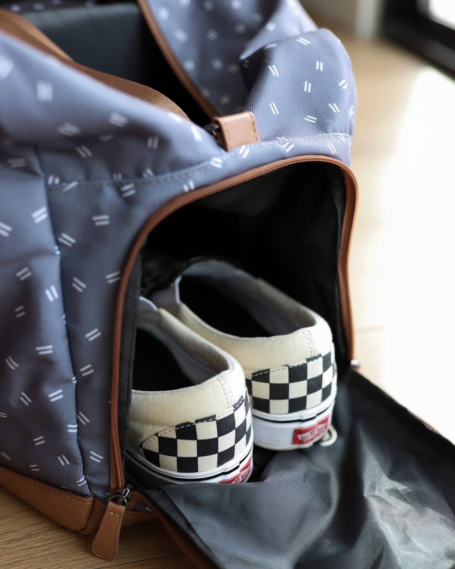 Here’s a few of my favorite details: * A pop up Velcro divider that lets you organize your bag in half, or use it all as one large bag depending on what you’re packing. * A pocket with two vents for shoes, dirty laundry, or whatever else you want to keep separate from the rest of your bag.